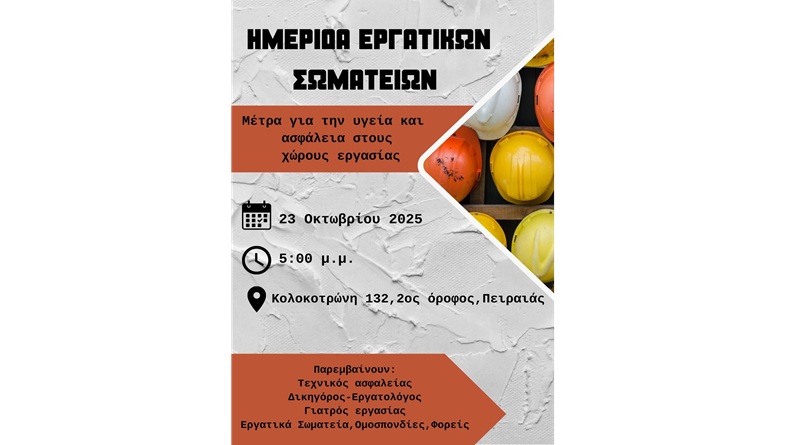 Ημερίδα 16 σωματείων για τα εργατικά ατυχήματα (video) 28/10/2025 28/10/2025 Δεν επιτρέπεται σχολιασμός στο Ημερίδα 16 σωματείων για τα εργατικά ατυχήματα (video) Νίκος Φωτόπουλος, Γ. Γραμματέας ΓΣΕΕ Κώστας Γενιδούνιας, Πρόεδρος ΠΕΠΕ Σταυρούλα Παπαδημητρίου, Μέλος ΕΕ ΑΔΕΔΥ, Πρόεδρος Συλλόγου Εργαζομένων Επιθεώρησης Εργασίας Γιώργος Ραντίτσας, Μέλος ΔΣ ΕΚΑ, Πρόεδρος Σωματείου Εργαζομένων στην Αποχέτευση ΕΥΔΑΠ