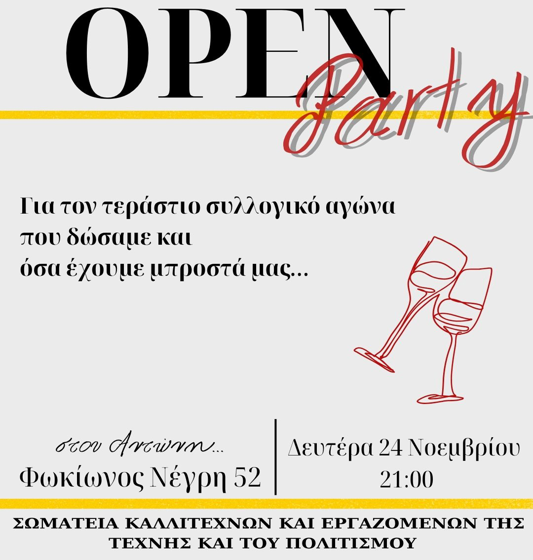 Έτσι, καλούμε όλους του καλλιτέχνες, ηθοποιούς, μουσικούς, χορευτές, κινηματογραφιστές, τους σπουδαστές, τους καθηγητές και όλο τον κόσμο που μας συμπαραστάθηκε, σε open party, την Δευτέρα 24 Νοεμβρίου, από τις 21:00 μ.μ. «στου Αντώνη…», οδός Φωκίωνος Νέγρη 52, Αθήνα.